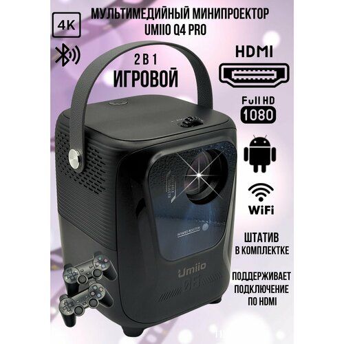 Проектор игровой Umiio Q4 Pro - это огромное разнообразие возможностей домашнего кинотеатра. Карта памяти с играми уже установлена. Мини проектор можно подключить в ноутбук или компьютер либо в Playstation 5 или 4. Проектор имеет яркость 7000, поддерживает дисплей 720p HD 30-230, встроенную систему Android версии 12.0, адаптируется к большему количеству прикладного программного обеспечения, Отличная система приема wi-fi 5G,использует передовые светодиодные технологии и технологию равномерного освещения, чтобы сделать края проекции ярче. Этот мини-проектор также использует технологию диффузного отражения для защитите свои глаза от усталости. Мини-портативный проектор. Этот мультимедийный мини-проектор имеет уникальный и элегантный дизайн. Он достаточно мал, чтобы поместиться в вашей сумке, поэтому, когда вы выходите на улицу, он очень легкий, его легко носить с собой и он подходит для проецирования различных сцен. Благодаря новейшей технологии регулирования температуры шум вентилятора был снижен на 80%, а эффект отвода тепла стал более эффективным. Это обеспечит вам потрясающее качество звука. Пожалуйста, обратите внимание, что наш проектор может поддерживать декодирование видео в формате 4K, но максимальное разрешение выходного видео составляет 1920x1280P.