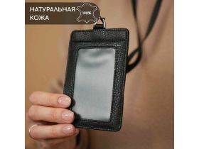 Бейдж для пропуска на ленте из натуральной кожи с чехлом для карт, черный 103068768246