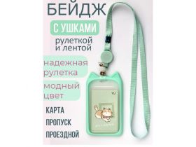 Бейдж с ушками Котик в силиконовой оправе, для пропуска, чехол для карты, с рулеткой на ленте, для аниме-карточки, для школьной карты. Детский. Зеленый. 102218111988