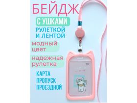 Бейдж с ушками Котик в силиконовой оправе, для пропуска, чехол для карты, с рулеткой на ленте, для аниме-карточки, для школьной карты. Детский. Розовый. 102227893873