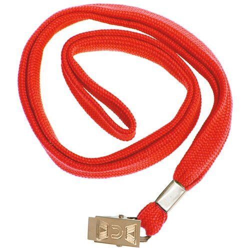 Съемный текстильный шнурок крепится к бейджу с помощью металлической клипсы. Цвет шнурка - красный.