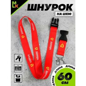 Стильный шнурок на шею с оригинальным принтом и с небольшим металлическим карабином на конце изделия.