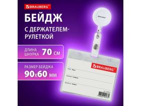 Бейдж горизонтальный (60х90 мм), с держателем-рулеткой 70 см, белый, BRAUBERG, 238241, в комплекте 20шт 103740446770