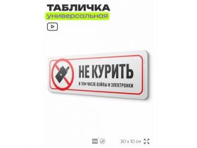 Табличка "Не курить, в том числе вейпы и электронки", на дверь и стену, информационная, пластиковая с двусторонним скотчем, 30х10 см, Айдентика Технолоджи 4609679778