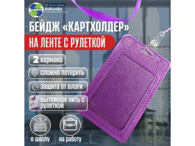 Бейдж для пропуска, картхолдер, с рулеткой и лентой, фиолетовый, 65x110 мм 102097236764
