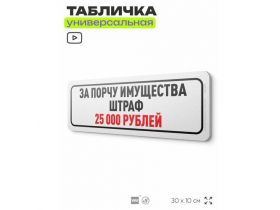 Табличка "За порчу имущества штраф 25 000 рублей", на дверь и стену, информационная, пластиковая с двусторонним скотчем, 30х10 см, Айдентика Технолоджи 4609672731