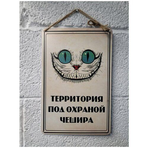 Найти - Территория под охраной чешира. Табличка металлическая, картина на жести, декор интерьера, плакат, постер, подарок