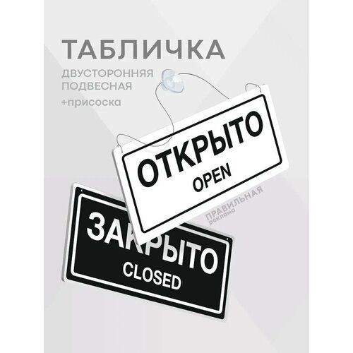 Найти - Табличка открыто закрыто 35х15 см. двусторонняя черно-белая / Информационная табличка на дверь (со шнурком и присоской)
