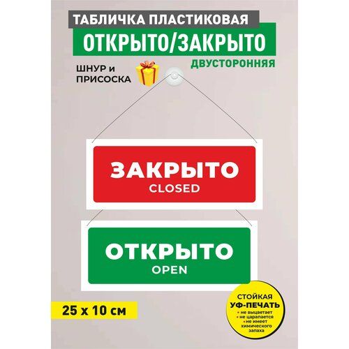 Информационная двусторонняя табличка Открыто-закрыто - неотъемлемая часть внешнего оформления любого заведения, будь то сфера обслуживания, такая как ресторан, кафе, салон красоты или предприятие торговли. Используется как средство оповещения о текущем статусе. Размер - 10х25 см. Благодаря ярким насыщенным цветам табличка будет хорошо заметна. Табличке не страшны погодные условия, она устойчива к внешним факторам, выгоранию на солнце, непогоде, перепаду температур, влагозащитна, не царапается, не имеет химического запаха. В подарок мы прилагаем силиконовую присоску и шнур, позволяющие без труда смонтировать и при необходимости демонтировать табличку Открыто-закрыто. Табличка станет прекрасным подарком на новоселье, День Рождения, Новый Год, да и просто без повода Друзья, родственники, коллеги, руководитель оценят ваш подарок, который прослужит долгие годы.