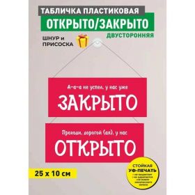 Информационная двусторонняя табличка Открыто-закрыто - неотъемлемая часть внешнего оформления любого заведения, будь то сфера обслуживания, такая как ресторан, кафе, салон красоты или предприятие торговли. Используется как средство оповещения о текущем статусе. Размер - 10х25 см. Благодаря ярким насыщенным цветам табличка будет хорошо заметна. Табличке не страшны погодные условия, она устойчива к внешним факторам, выгоранию на солнце, непогоде, перепаду температур, влагозащитна, не царапается, не имеет химического запаха. В подарок мы прилагаем силиконовую присоску и шнур, позволяющие без труда смонтировать и при необходимости демонтировать табличку Открыто-закрыто. Табличка станет прекрасным подарком на новоселье, День Рождения, Новый Год, да и просто без повода Друзья, родственники, коллеги, руководитель оценят ваш подарок, который прослужит долгие годы.