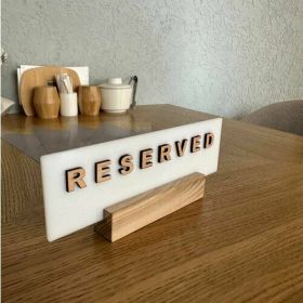 Стильная табличка Reserved, информирующая о занятости столика в кафе или ресторане. Стильная, качественная табличка резерв сразу даст понять гостям, что у вас придерживаются самых высоких стандартов обслуживания. Основание таблички и объемные буквы выполнены из массива ясеня. Декоративным элементом служит пластик. Благодаря сочетанию ясеня и искусственных материалов табличка на стол резерв смотрится стильно и оригинально. Табличка для размещения отлично подойдет для столиков кафе или ресторанов. Прекрасно вписывается в современный дизайн интерьера. Деревянное основание сочетается с вырезанными объемными деревянными буквами.