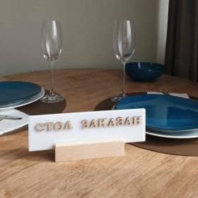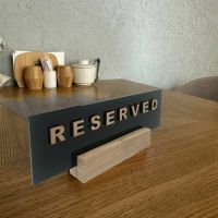 - Стильная табличка Reserved, информирующая о занятости столика в кафе или ресторане. Стильная, качественная табличка резерв сразу даст понять гостям, что у вас придерживаются самых высоких стандартов обслуживания. Основание таблички и объемные буквы выполнены из массива ясеня. Декоративным элементом служит пластик. Благодаря сочетанию ясеня и искусственных материалов табличка на стол резерв смотрится стильно и оригинально. Табличка для размещения отлично подойдет для столиков кафе или ресторанов. Прекрасно вписывается в современный дизайн интерьера. Деревянное основание сочетается с вырезанными объемными деревянными буквами.