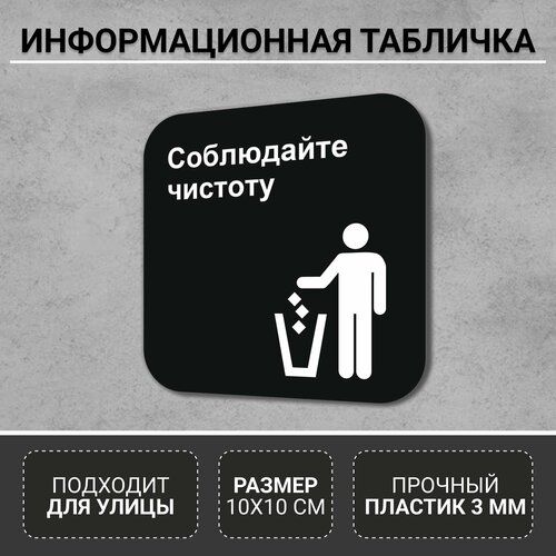 Табличка информационная значок указатель Соблюдайте чистоту. Информационная табличка на дверь это универсальное и стильное решение по оформлению помещения. Табличка на стену выполнена из черного пластика и крепится с помощью двустороннего скотча, который уже нанесен на пластиковую табличку. Размер таблички 10х10 см. Используется пленка белого цвета. Навигационные таблички черного цвета будут выглядеть стильно в любом интерьере. Таблички на стену, дверь, для офиса, торгового центра, кафе, ресторана, школы, фитнес-клуба, бассейна, офиса продаж, бара, здания, театра, кинотеатра, музея, оформления помещения, гаража. Мы предлагает обширный перечень навигационных указателей на ваш выбор.