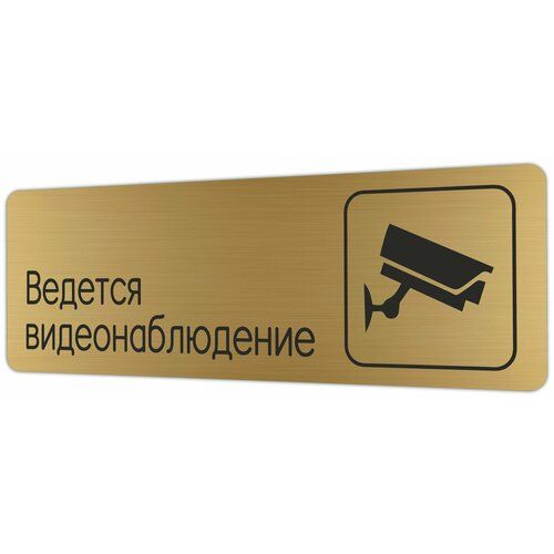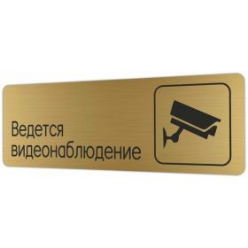 Табличка ведется видеонаблюдение из золотистого пластика с царапанной текстурой размером 30х10 см. На обратной стороне таблички - двусторонняя клейкая лента для монтажа таблички без сверления. Текст и пиктограмма на табличку наносятся методом гравировки, такм образом изображение на табличке не будет сдираться, а также устойчиво к выгоранию и механическим повреждениям. При необходимости табличку можно протирать влажной тряпкой или салфетками. Табличка с гравировкой с надписью ведется видеонаблюдение имеет сертификат ГОСТ и изготовлена из материалов не поддерживающих горение