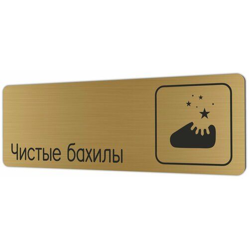 Табличка Чистые бахилы из золотистого пластика с царапанной текстурой размером 30х10 см. На обратной стороне таблички - двусторонняя клейкая лента для монтажа таблички без сверления. Текст и пиктограмма на табличку наносятся методом гравировки, такм образом изображение на табличке не будет сдираться, а также устойчиво к выгоранию и механическим повреждениям. При необходимости табличку можно протирать влажной тряпкой или салфетками. Табличка с гравировкой с надписью Чистые бахилы имеет сертификат ГОСТ и изготовлена из материалов не поддерживающих горение