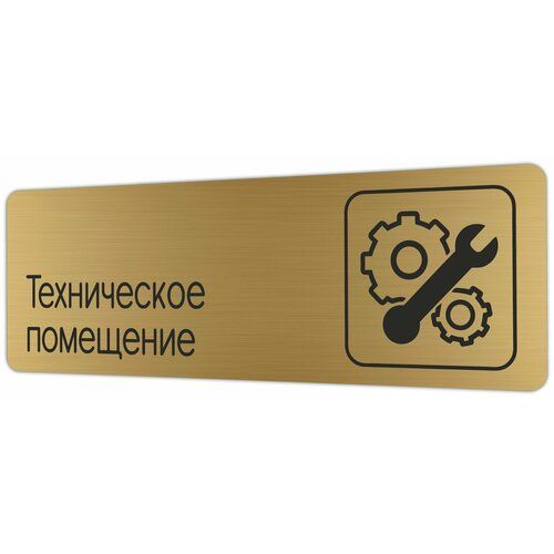 Табличка Техническое помещение из золотистого пластика с царапанной текстурой размером 30х10 см. На обратной стороне таблички - двусторонняя клейкая лента для монтажа таблички без сверления. Текст и пиктограмма на табличку наносятся методом гравировки, такм образом изображение на табличке не будет сдираться, а также устойчиво к выгоранию и механическим повреждениям. При необходимости табличку можно протирать влажной тряпкой или салфетками. Табличка с гравировкой с надписью Техническое помещение имеет сертификат ГОСТ и изготовлена из материалов не поддерживающих горение
