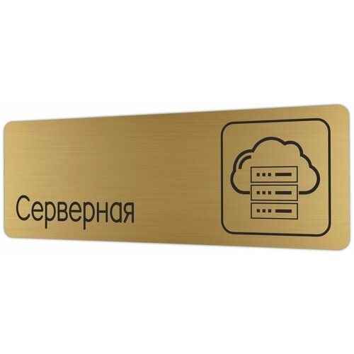Табличка Серверная из золотистого пластика с царапанной текстурой размером 30х10 см. На обратной стороне таблички - двусторонняя клейкая лента для монтажа таблички без сверления. Текст и пиктограмма на табличку наносятся методом гравировки, такм образом изображение на табличке не будет сдираться, а также устойчиво к выгоранию и механическим повреждениям. При необходимости табличку можно протирать влажной тряпкой или салфетками. Табличка с гравировкой с надписью Серверная имеет сертификат ГОСТ и изготовлена из материалов не поддерживающих горение