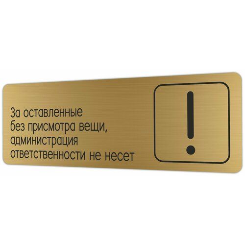 Табличка За оставленные без присмотра вещи, администрация ответственности не несет из золотистого пластика с царапанной текстурой размером 30х10 см. На обратной стороне таблички - двусторонняя клейкая лента для монтажа таблички без сверления. Текст и пиктограмма на табличку наносятся методом гравировки, такм образом изображение на табличке не будет сдираться, а также устойчиво к выгоранию и механическим повреждениям. При необходимости табличку можно протирать влажной тряпкой или салфетками. Табличка с гравировкой с надписью За оставленные без присмотра вещи, администрация ответственности не несет имеет сертификат ГОСТ и изготовлена из материалов не поддерживающих горение