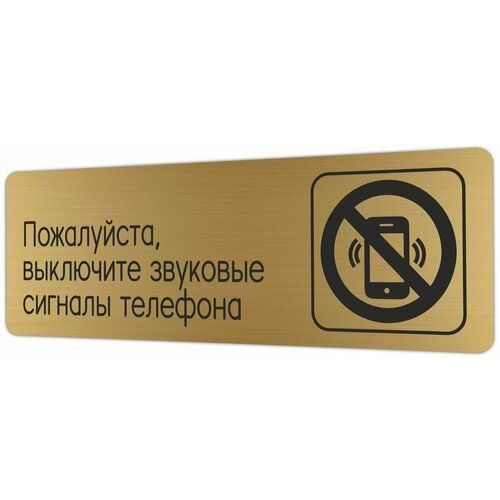 Табличка Пожалуйста, выключите звуковые сигналы телефона из золотистого пластика с царапанной текстурой размером 30х10 см. На обратной стороне таблички - двусторонняя клейкая лента для монтажа таблички без сверления. Текст и пиктограмма на табличку наносятся методом гравировки, такм образом изображение на табличке не будет сдираться, а также устойчиво к выгоранию и механическим повреждениям. При необходимости табличку можно протирать влажной тряпкой или салфетками. Табличка с гравировкой с надписью Пожалуйста, выключите звуковые сигналы телефона имеет сертификат ГОСТ и изготовлена из материалов не поддерживающих горение