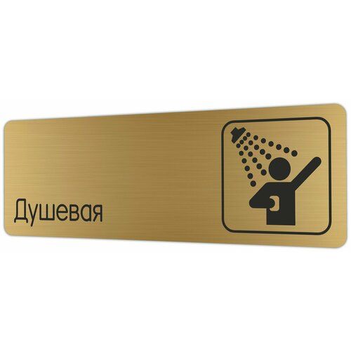 Табличка Душевая из золотистого пластика с царапанной текстурой размером 30х10 см. На обратной стороне таблички - двусторонняя клейкая лента для монтажа таблички без сверления. Текст и пиктограмма на табличку наносятся методом гравировки, такм образом изображение на табличке не будет сдираться, а также устойчиво к выгоранию и механическим повреждениям. При необходимости табличку можно протирать влажной тряпкой или салфетками. Табличка с гравировкой с надписью Душевая имеет сертификат ГОСТ и изготовлена из материалов не поддерживающих горение