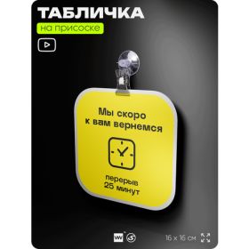 Найти - Табличка Перерыв 25 минут, для магазина на дверь, табличка перерыв на присоске, 16х16 см, Айдентика Технолоджи