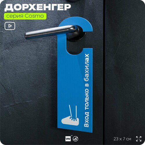 Дорхенгер Входить в бахилах на дверь серии COSMO от Айдентика Технолоджи. Голубой пластиковый дорхенгер на ручку двери выполнен из качественного материала в минималистичном дизайне. Дорхенгер входить в бахилах это информационная табличка на дверь, которую размещают на дверной ручке информируя о необходимости входить в только в бахилах. Табличка на дверь дорхенгер это универсальное решение которое подойдет для офиса, переговорной, отеля, коворкинга, конференц-зала, туалета, аудитории во время проведения семинаров и занятий. Пластиковую табличку дорхенгер на дверь также можно использовать для дома, чтобы обозначить границы личного пространства и попросить временно не беспокоить.