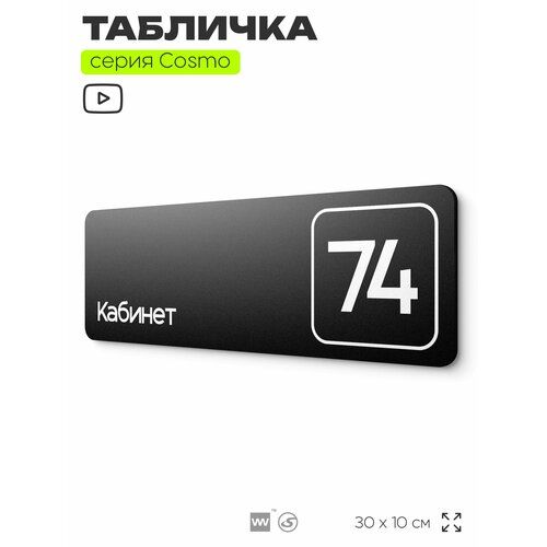 Найти - Табличка с номером кабинета Кабинет №74, для офиса, 30 х 10 см, серия COSMO, черная, Айдентика Технолоджи