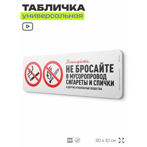 Найти - Табличка Не бросайте в мусоропровод непотушенные сигареты и спички, на дверь и стену, для подъезда, информационная, пластиковая с двусторонним скотчем, 30х10 см, Айдентика Технолоджи