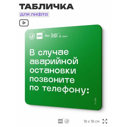 Табличка с правилами эвакуации и помощи "В случае аварийной остановки позвоните по телефону" для лифта и холла, 18х18 см, пластиковая, SilverPlane x Айдентика Технолоджи, пластиковая ПВХ с креплением на самоклеящейся основе, с правилами поведения и соблюдения норм безопасности в лифте. Наша табличка-вывеска отлично подойдет для грузового и обычного лифта в дом, офисное или производственное здание, больницу, многоэтажку и малоэтажное здание с любыми лифтами. Таблички можно разместить на стену, дверь, зеркало, любую гладкую и даже слегка структурную поверхность. Это легкий способ украсить и обезопасить пространство лифта и прилифтовой территории холла.