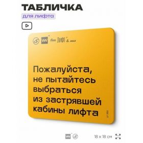 Табличка с правилами для лифта "Не пытайтесь выбраться из застрявшей кабины лифта", 18х18 см, пластиковая, SilverPlane x Айдентика Технолоджи, пластиковая ПВХ с креплением на самоклеящейся основе, с правилами поведения и соблюдения норм безопасности в лифте. Наша табличка-вывеска отлично подойдет для грузового и обычного лифта в дом, офисное или производственное здание, больницу, многоэтажку и малоэтажное здание с любыми лифтами. Таблички можно разместить на стену, дверь, зеркало, любую гладкую и даже слегка структурную поверхность. Это легкий способ украсить и обезопасить пространство лифта и прилифтовой территории холла.