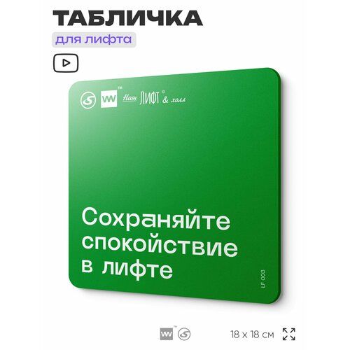 Табличка с правилами эвакуации и помощи "Сохраняйте спокойствие в лифте" для лифта и холла, 18х18 см, пластиковая, SilverPlane x Айдентика Технолоджи, пластиковая ПВХ с креплением на самоклеящейся основе, с правилами поведения и соблюдения норм безопасности в лифте. Наша табличка-вывеска отлично подойдет для грузового и обычного лифта в дом, офисное или производственное здание, больницу, многоэтажку и малоэтажное здание с любыми лифтами. Таблички можно разместить на стену, дверь, зеркало, любую гладкую и даже слегка структурную поверхность. Это легкий способ украсить и обезопасить пространство лифта и прилифтовой территории холла.