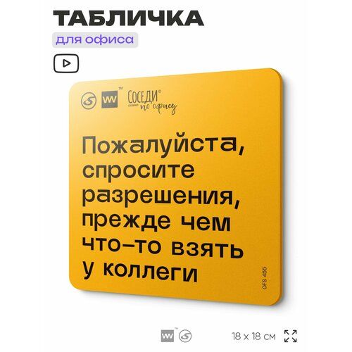Табличка с правилами офиса "Спросите разрешения, прежде чем что-то взять у коллеги" 18х18 см, пластиковая, SilverPlane x Айдентика Технолоджи 103696272170