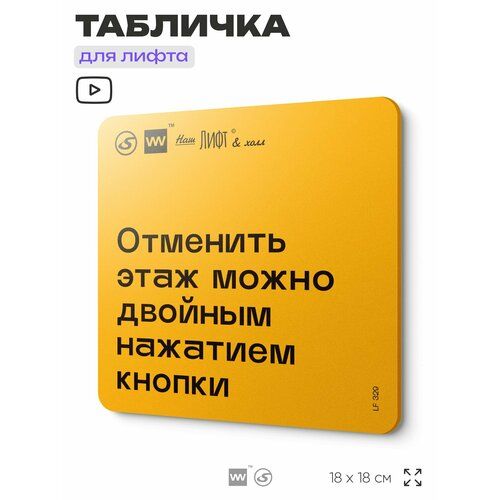 Табличка с правилами для лифта "Отменить лифт можно двойным нажатием кнопки", 18х18 см, пластиковая, SilverPlane x Айдентика Технолоджи, пластиковая ПВХ с креплением на самоклеящейся основе, с правилами поведения и соблюдения норм безопасности в лифте. Наша табличка-вывеска отлично подойдет для грузового и обычного лифта в дом, офисное или производственное здание, больницу, многоэтажку и малоэтажное здание с любыми лифтами. Таблички можно разместить на стену, дверь, зеркало, любую гладкую и даже слегка структурную поверхность. Это легкий способ украсить и обезопасить пространство лифта и прилифтовой территории холла.