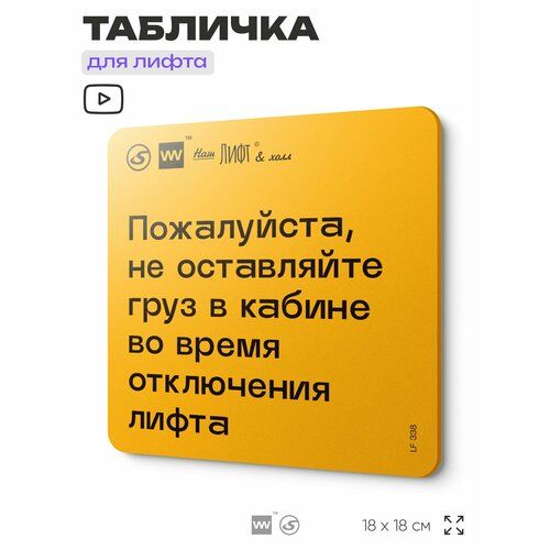 Табличка с правилами для лифта "Не оставляйте груз в кабине во время отключения лифта", 18х18 см, пластиковая, SilverPlane x Айдентика Технолоджи, пластиковая ПВХ с креплением на самоклеящейся основе, с правилами поведения и соблюдения норм безопасности в лифте. Наша табличка-вывеска отлично подойдет для грузового и обычного лифта в дом, офисное или производственное здание, больницу, многоэтажку и малоэтажное здание с любыми лифтами. Таблички можно разместить на стену, дверь, зеркало, любую гладкую и даже слегка структурную поверхность. Это легкий способ украсить и обезопасить пространство лифта и прилифтовой территории холла.