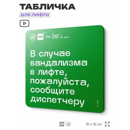Табличка с правилами эвакуации и помощи "В случае вандализма сообщите диспетчеру" для лифта и холла, 18х18 см, пластиковая, SilverPlane x Айдентика Технолоджи, пластиковая ПВХ с креплением на самоклеящейся основе, с правилами поведения и соблюдения норм безопасности в лифте. Наша табличка-вывеска отлично подойдет для грузового и обычного лифта в дом, офисное или производственное здание, больницу, многоэтажку и малоэтажное здание с любыми лифтами. Таблички можно разместить на стену, дверь, зеркало, любую гладкую и даже слегка структурную поверхность. Это легкий способ украсить и обезопасить пространство лифта и прилифтовой территории холла.