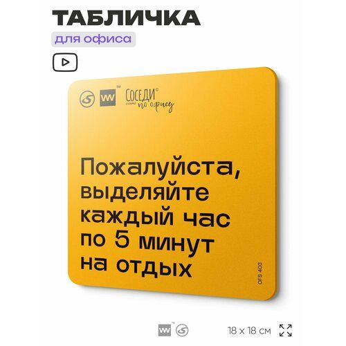 Табличка с правилами офиса "Выделяйте каждый час по 5 минут на отдых" 18х18 см, пластиковая, SilverPlane x Айдентика Технолоджи 103696277078
