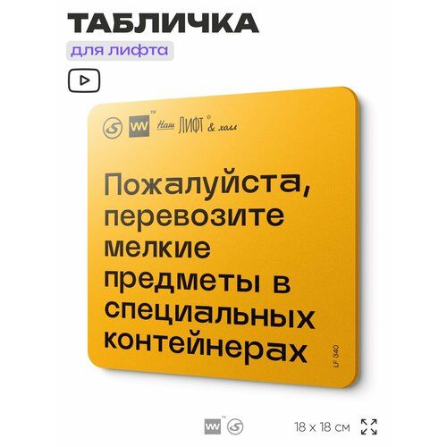 Табличка с правилами для лифта "Провозите мелкие предметы в контейнерах", 18х18 см, пластиковая, SilverPlane x Айдентика Технолоджи, пластиковая ПВХ с креплением на самоклеящейся основе, с правилами поведения и соблюдения норм безопасности в лифте. Наша табличка-вывеска отлично подойдет для грузового и обычного лифта в дом, офисное или производственное здание, больницу, многоэтажку и малоэтажное здание с любыми лифтами. Таблички можно разместить на стену, дверь, зеркало, любую гладкую и даже слегка структурную поверхность. Это легкий способ украсить и обезопасить пространство лифта и прилифтовой территории холла.