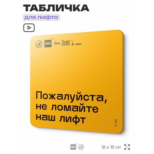 Табличка с правилами для лифта "Не ломайте наш лифт", 18х18 см, пластиковая, SilverPlane x Айдентика Технолоджи, пластиковая ПВХ с креплением на самоклеящейся основе, с правилами поведения и соблюдения норм безопасности в лифте. Наша табличка-вывеска отлично подойдет для грузового и обычного лифта в дом, офисное или производственное здание, больницу, многоэтажку и малоэтажное здание с любыми лифтами. Таблички можно разместить на стену, дверь, зеркало, любую гладкую и даже слегка структурную поверхность. Это легкий способ украсить и обезопасить пространство лифта и прилифтовой территории холла.