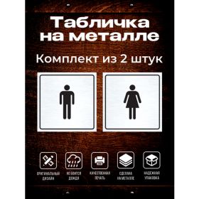 Придайте своему интерьеру стиль и функциональность с алюминиевыми табличками на двери туалета. В комплект входят две таблички — для мужчин и женщин, размером 12х12 см. Эти металлические изделия идеально подойдут для оформления дверей туалетных комнат, добавляя изюминку в ваш дом или офис.