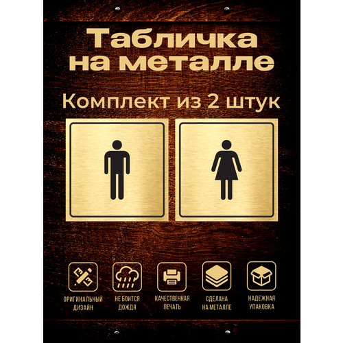Найти - Табличка алюминиевая на дверь туалета, 12х12 см. комплект М и Ж из 2х штук, Золотой фон