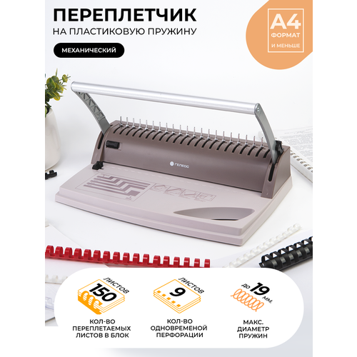 Переплетная машина дает возможность сделать практичный и экономичный переплет на пластиковую пружину диаметром до 19 мм, это блок объемом в 150 листов. Такой вид переплета позволяет свободно пользоваться оформленным материалом: раскрывать документ на любой градус или копировать, заменять, добавлять и убирать листы. Преимущества: легкий, удобный при переносе, компактный. Лаконичный корпус, на станине для удобства работы имеется упор для бумаги, есть ручка для переноса, и удобная таблица для подбора пружины и пошаговая инструкция.