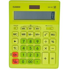 Калькулятор CASIO GR-12C-GN-W-EPКалькулятор настольный CASIO GR-12С-GN (210х155 мм), 12 разрядов, двойное питание, салатовый, GR-12C-GN-W-EPНастольный калькулятор в пластиковом корпусе салатового цвета с большим ЖК-дисплеем. Производит все основные математические действия. Эргономичная клавиатура с цветовой дифференциацией позволяет быстро производить вычисления. Разрядность дисплея: 12. Серия: GR-1. Тип размера: полноразмерный. Тип применения: универсальный. Функционал: вычисление наценки (MU), расчет процентов. Исполнение: настольный. Число строк дисплея: 1. Тип питания: батарейки, солнечный элемент. Цвет панели: салатовый. Длина корпуса: 209 мм. Ширина корпуса: 155 мм. Высота корпуса: 35 мм Бренд - CASIO. Производитель - Филиппины. Артикул производителя - GR-12C-GN-W-EP. Штрихкод - 4549526701009Характеристики упаковки: Вес: 0,3210 кг. Объем: 0,0019 м3. Размеры: 3,5x24,4x16,2 см.