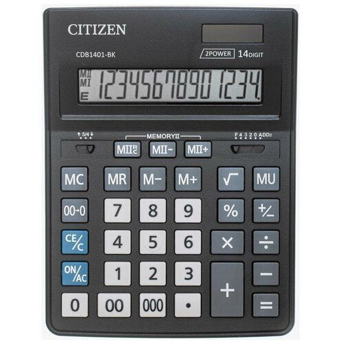 14-ти разрядный настольный калькулятор Citizen CDB1401-BK – незаменимый помощник в офисе, школе и дома. Оптимальный набор функций поможет автоматизировать расчёты: вычисление квадратного корня, коррекция последнего введенного значения, кнопка «00» и «000», двойная память, расчёт наценки. Двойное питание (солнечная батарея + батарейка AG10(LR1130)) и автоматическое отключение увеличивают срок службы. Упакован в картонную коробку. Размер калькулятора – 155*205*35 мм, вес – 200 г, цвет – чёрный