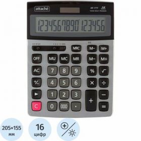 Калькулятор Attache AF-777 настольный в пластиковом корпусе с 16-разрядным дисплеем. В калькуляторе имеется два источника питания: солнечная батарея и 1 батарейка LR54. Размер: 205×155×35 мм. Тип клавиатуры: пластик.