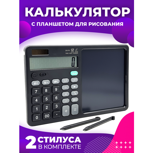 Калькулятор с планшетом ZH-70 Black работает от батарейки и солнечного элемента, имеет два стилуса и функцию защиты от стирания, что делает его полезным для учёбы, работы и повседневных задач.