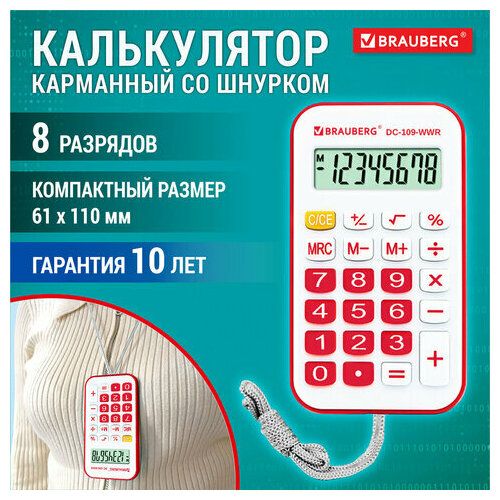 Карманный калькулятор со шнурком BRAUBERG DC-109-WWR - компактный и надежный.