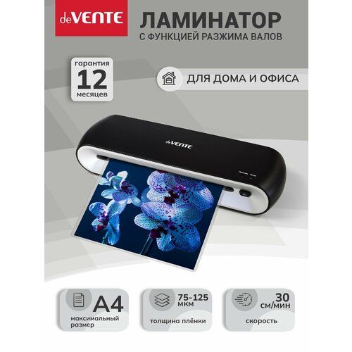 Ламинатор A4 DV745 "deVENTE" (360x102x66 мм), для горячего ламинирования, с функцией "антизамятие" для пакетных пленок толщиной 75-125 мкм, максимальная ширина пленки 230 мм, максимальная толщина готового документа 0,5 мм, скорость ламинирования 30 см/мин, время разогрева 2-4 мин, защита от перегрева, гарантия 12 мес, индивидуальная упаковка.