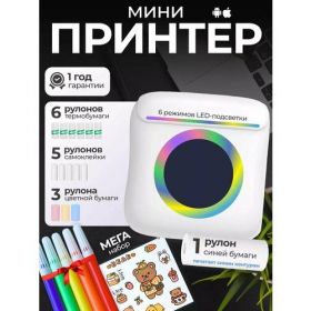 Самый большой набор с портативным мини принтером для наклеек, печати цветных и монохромных фотографий, этикеток, чеков или шпаргалок для школы. В набор включены 7 рулонов термобумаги, 5 рулонов самоклеящейся бумаги подходящей для печати ярлыков, бирок или детских мини раскрасок, 3 цветных рулона, 6 разноцветных фломастеров, а также USB-кабель для зарядки. Так же в наборе Новинка среди принтеров для наклеек - рулон бумаги для синей печати. Карманный принтер - это мгновенная и моментальная печать чеков, фотокарточек, монохромных или цветных мини-фотографий с телефона, планшета или компьютера.
