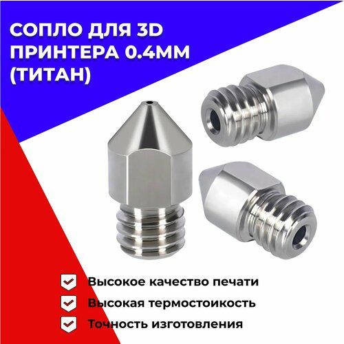 Титановое сопло 0.4 мм для MK7 \ MK8. Титановое сопло для 3D принтера рассчитано на больший ресурс при работе со стандартными пластиками, а так же рекомендовано к установке при работе с наполненными материалами и высокотемпературными материалами. Подходит для большинства моделей 3д принтеров Anycubic, Wanhao, Creality, Ender 3, FlashForge, FlyingBear и других с хотэндом MK7 \ MK8Характеристики изделия: