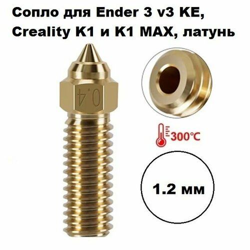 Сопло 1,2 мм идеально подойдёт для 3D-принтеров Ender 3 v3 KE, Creality K1 и K1 MAX. Это латунное сопло с резьбой M6 обеспечивает отличное качество печати благодаря своей высокой прочности и устойчивости к износу.